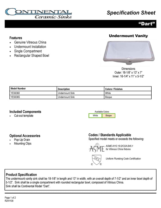 Vanity White Rectangle - Porcelain - Continental Ceramic YES6360