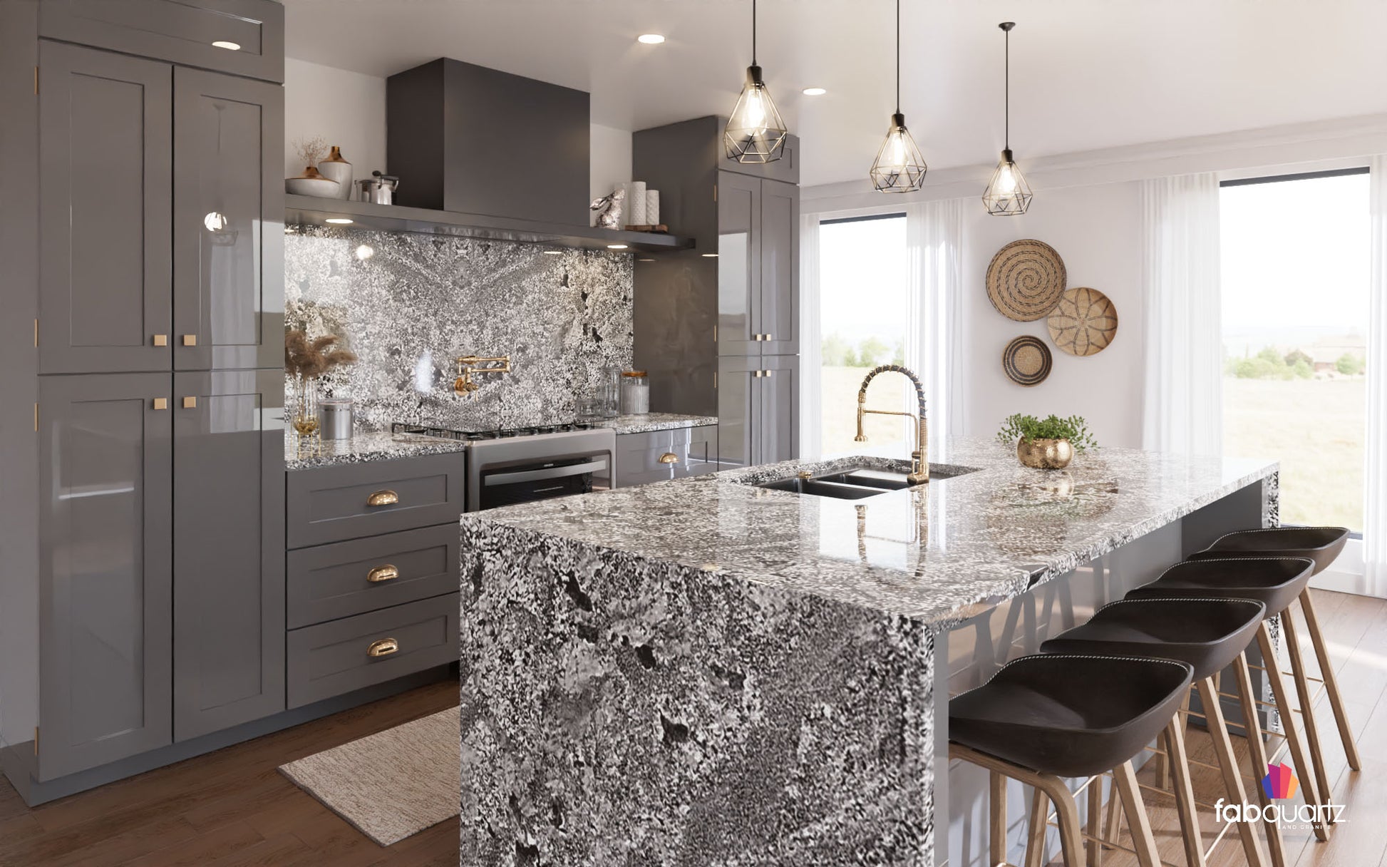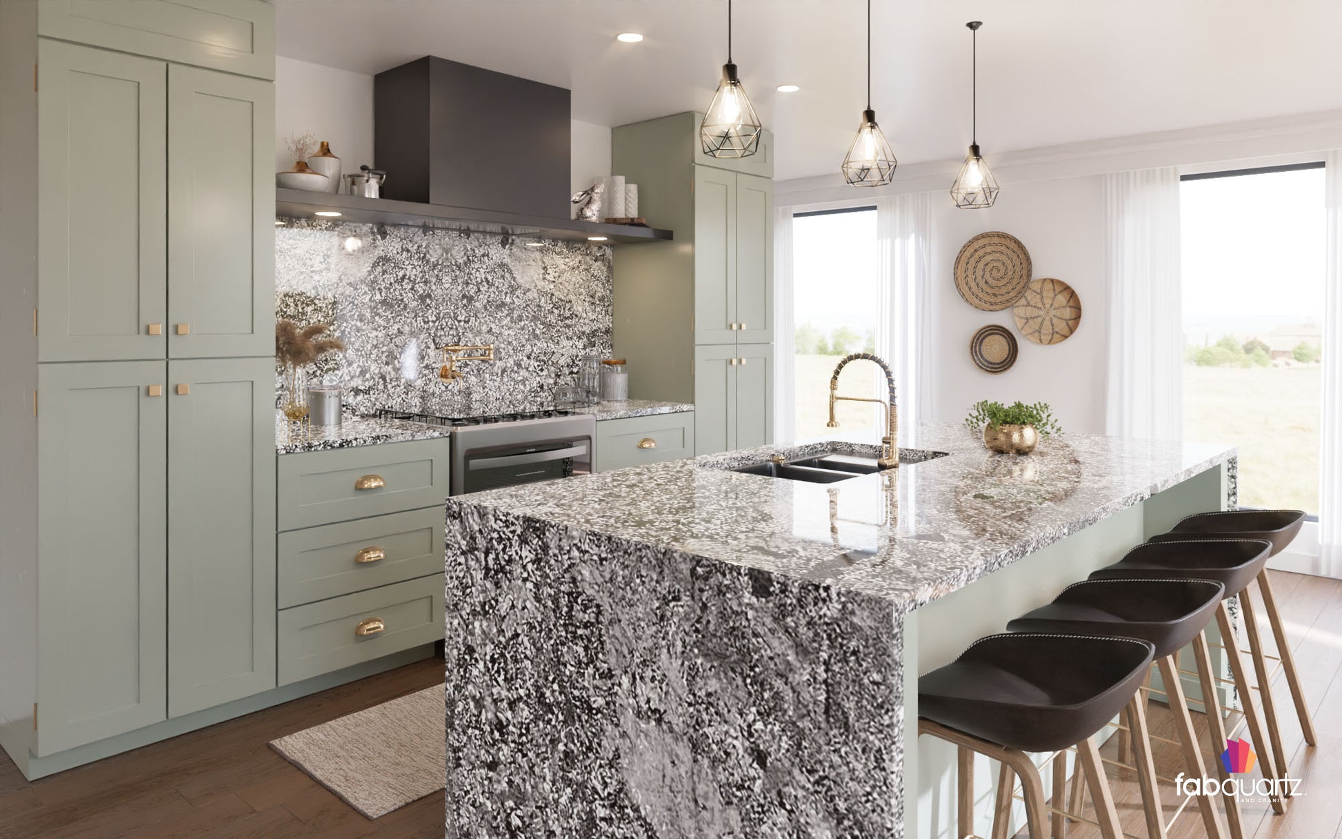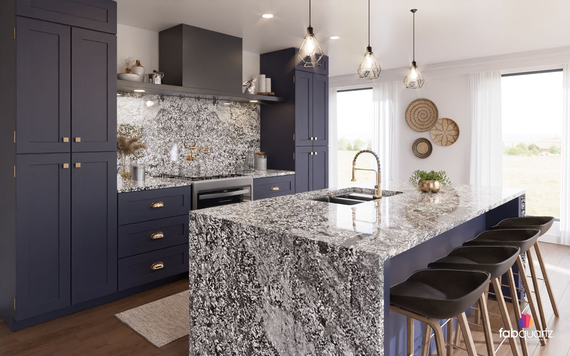 Ash Blue granite is rich with black and white contrast, shimmering crystals and flowing features. With its high polish and beautiful patterns, Ash Blue granite countertops and backsplashes can make a statement in any kitchen or bath. Call to talk with a FabQuartz design expert today.