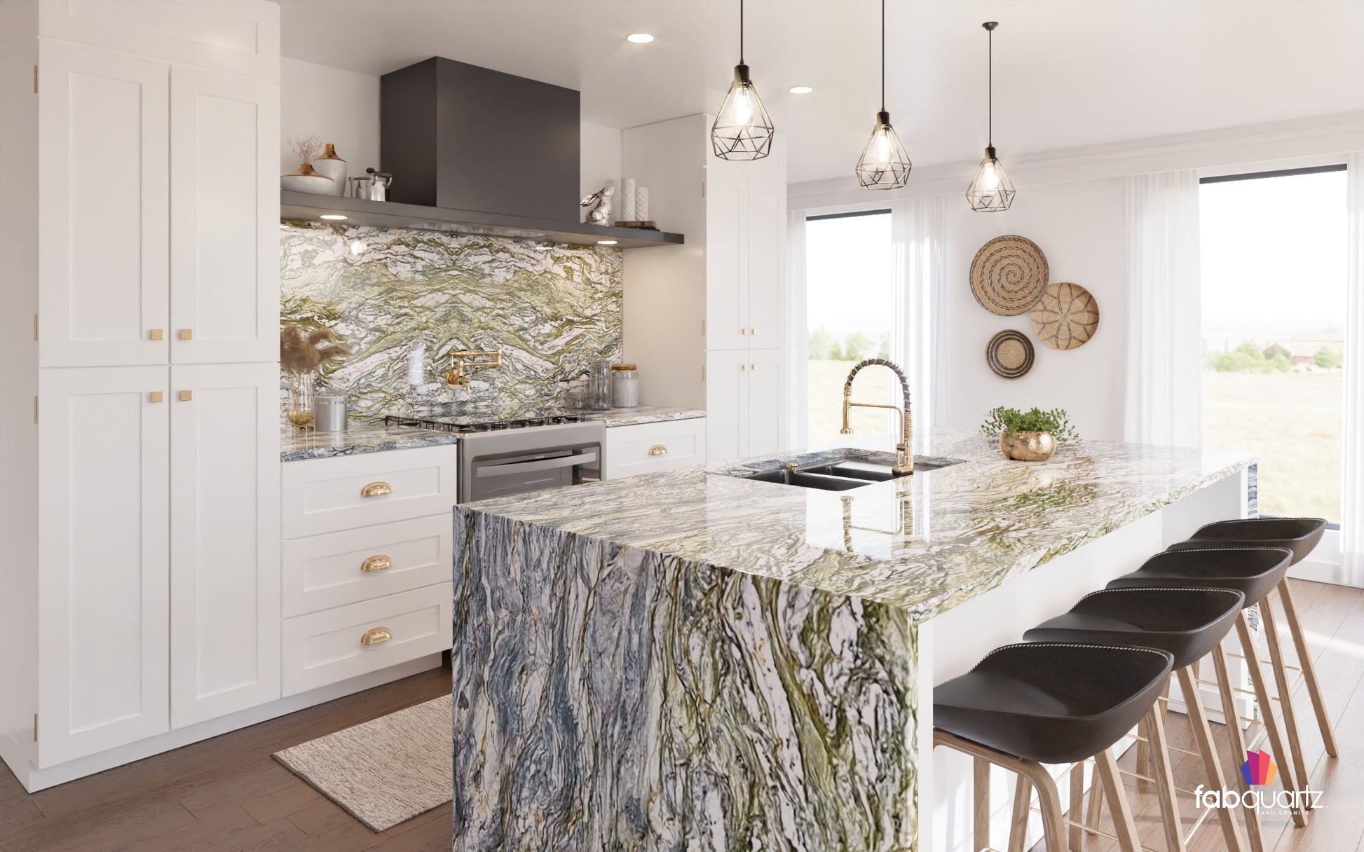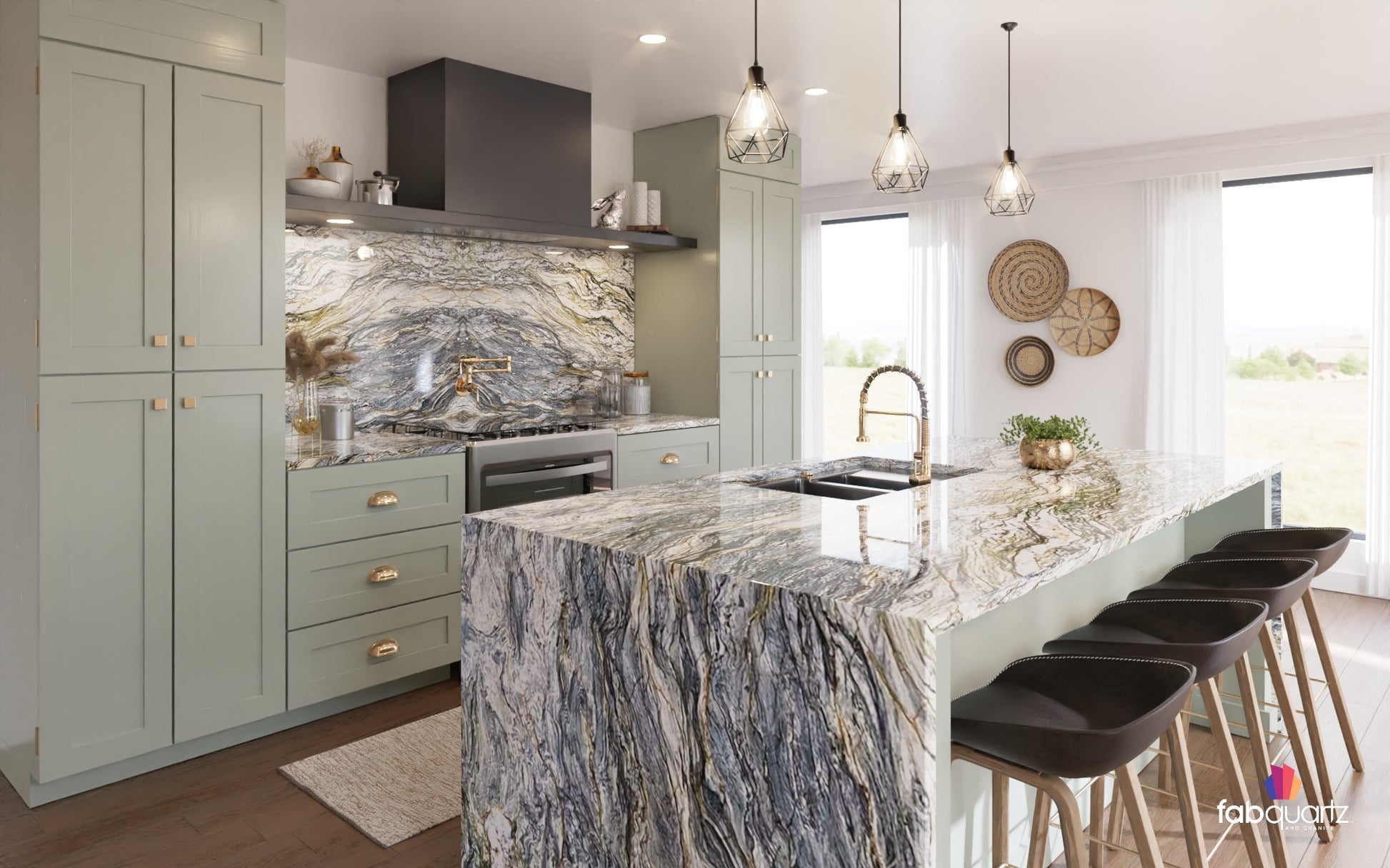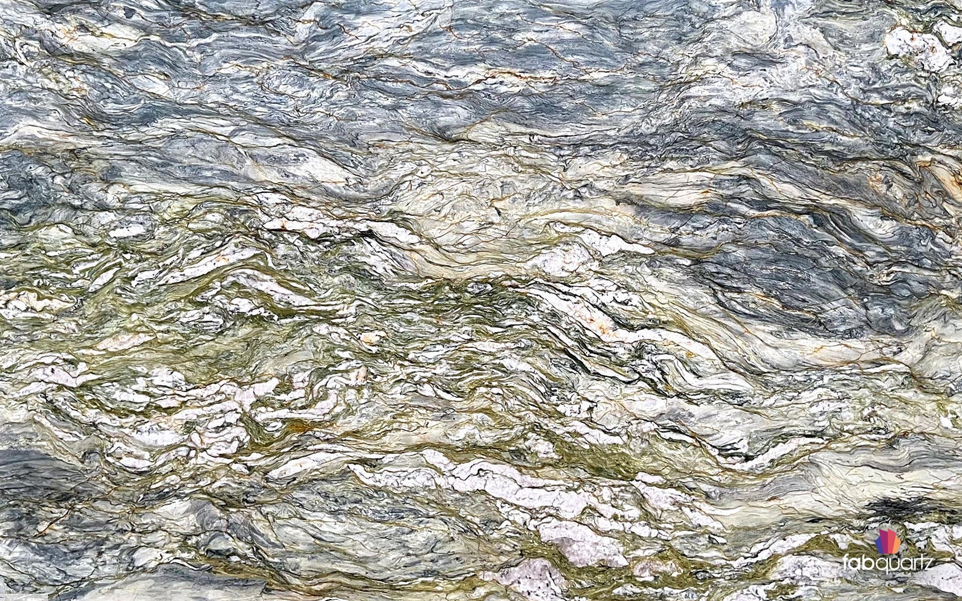 Explosion Blue Quartzite features flowing blue and green veins interspersed with icy white. This rare cut can give a stunning natural aesthetic to any kitchen or bathroom redesign. Call to talk with a FabQuartz natural stone expert today.