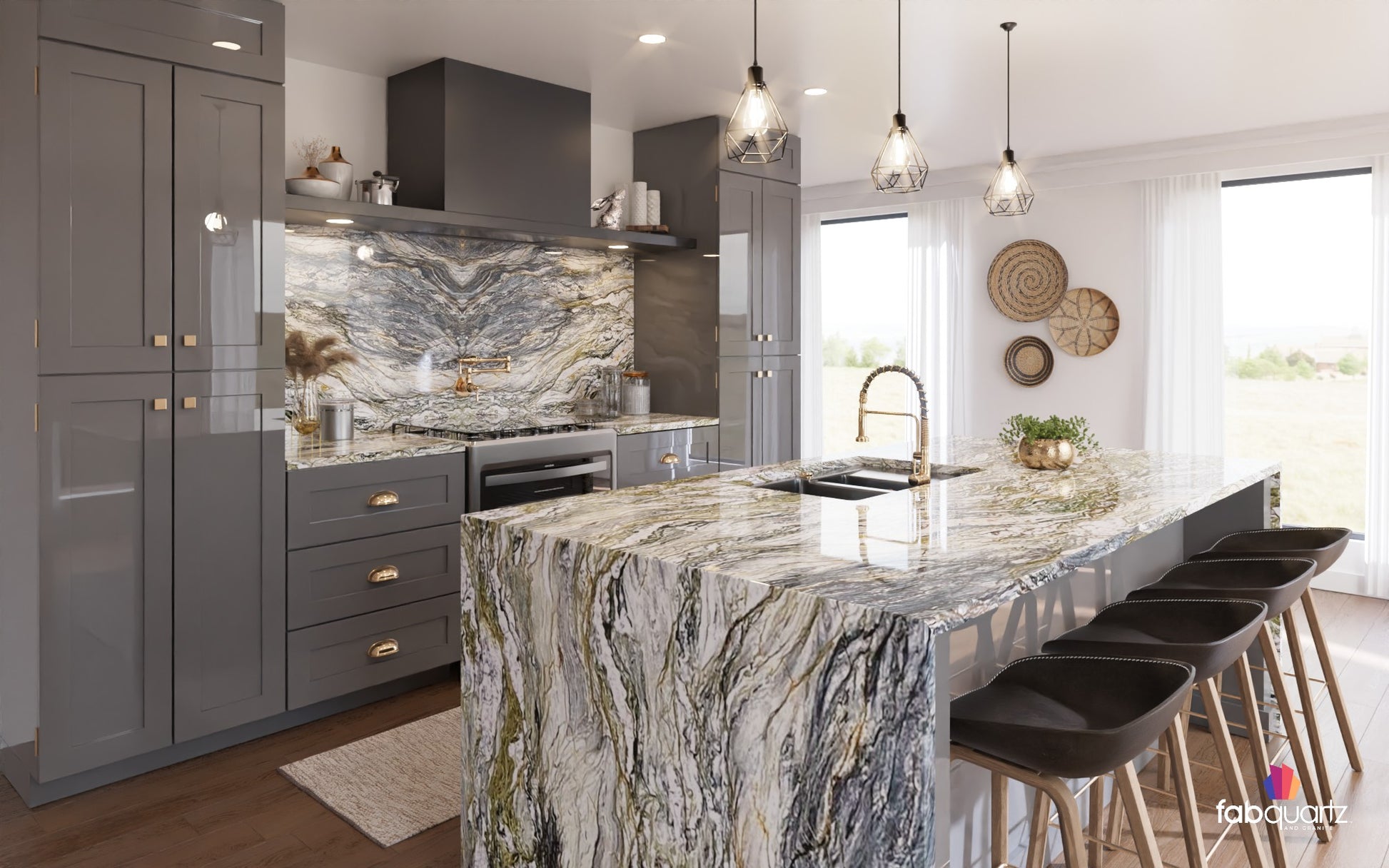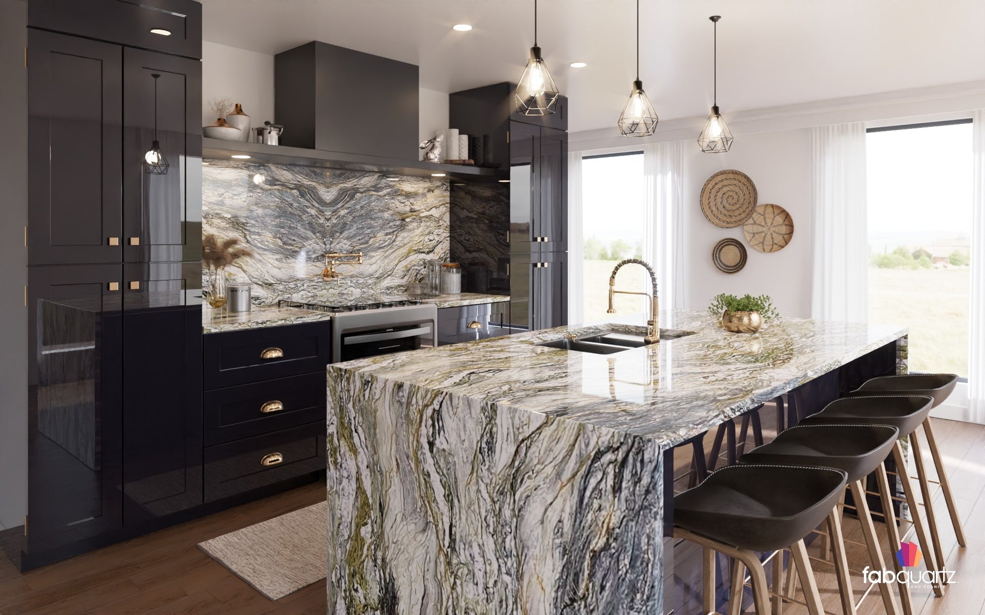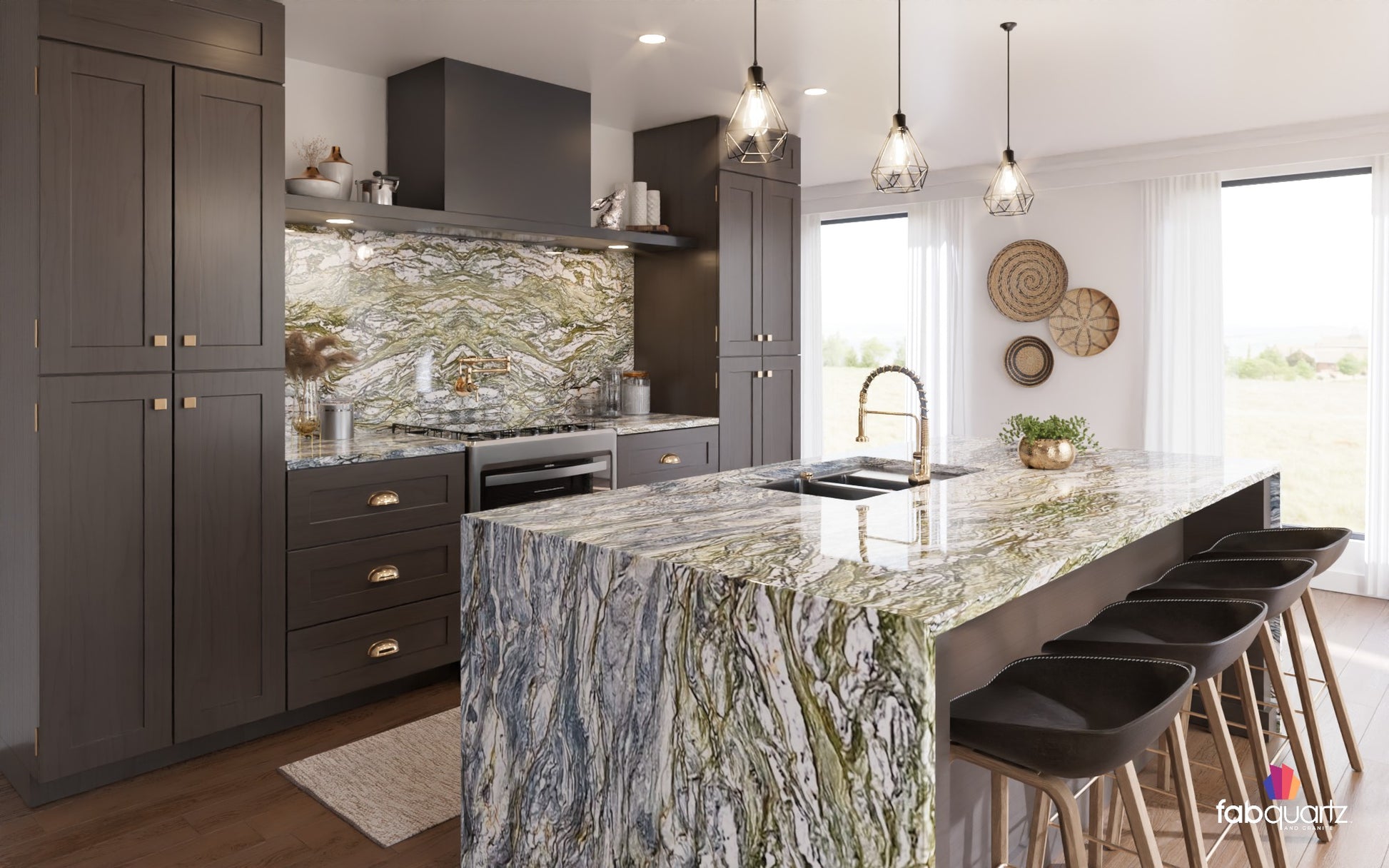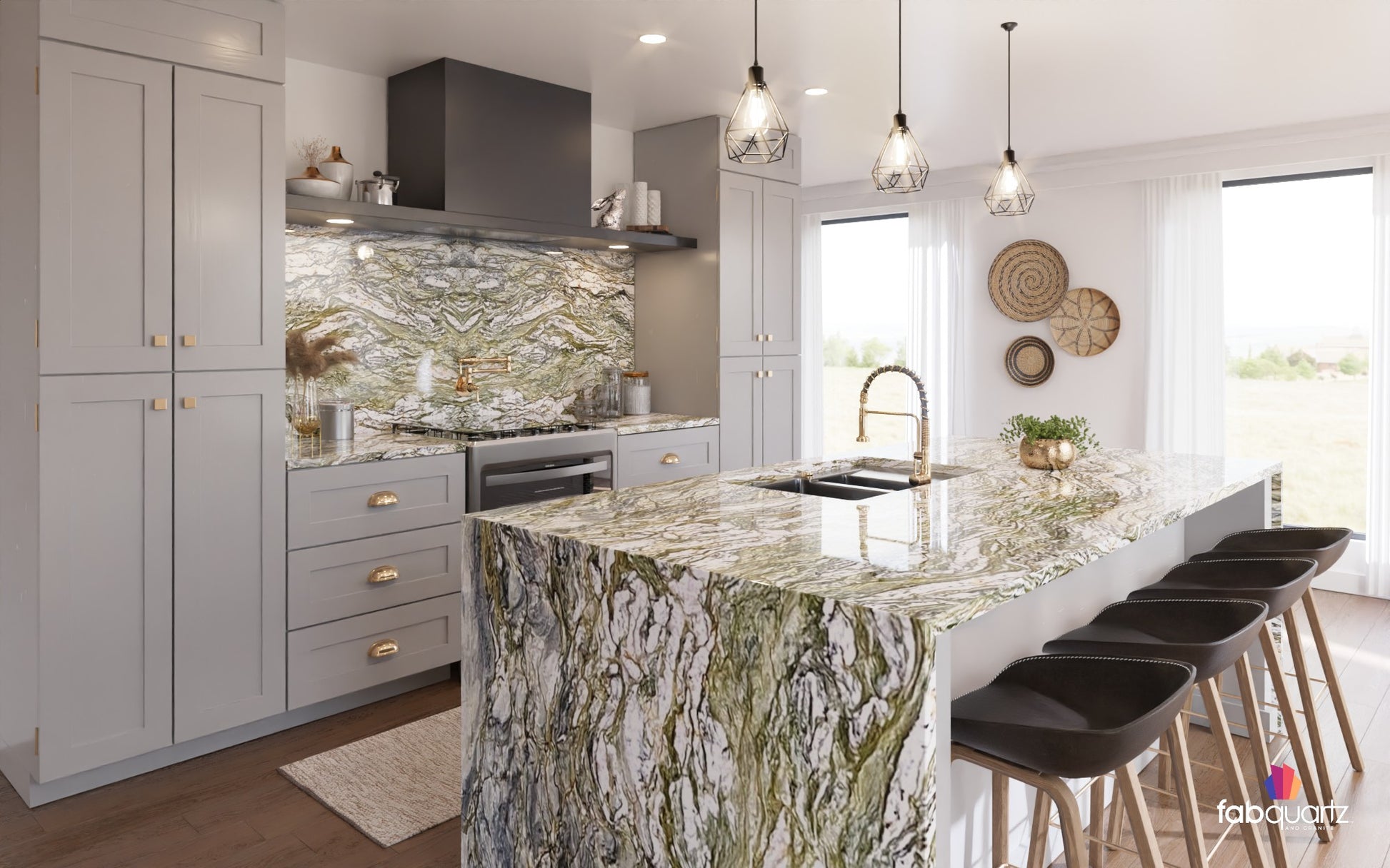 Explosion Blue Quartzite features flowing blue and green veins interspersed with icy white. This rare cut can give a stunning natural aesthetic to any kitchen or bathroom redesign. Call to talk with a FabQuartz natural stone expert today.