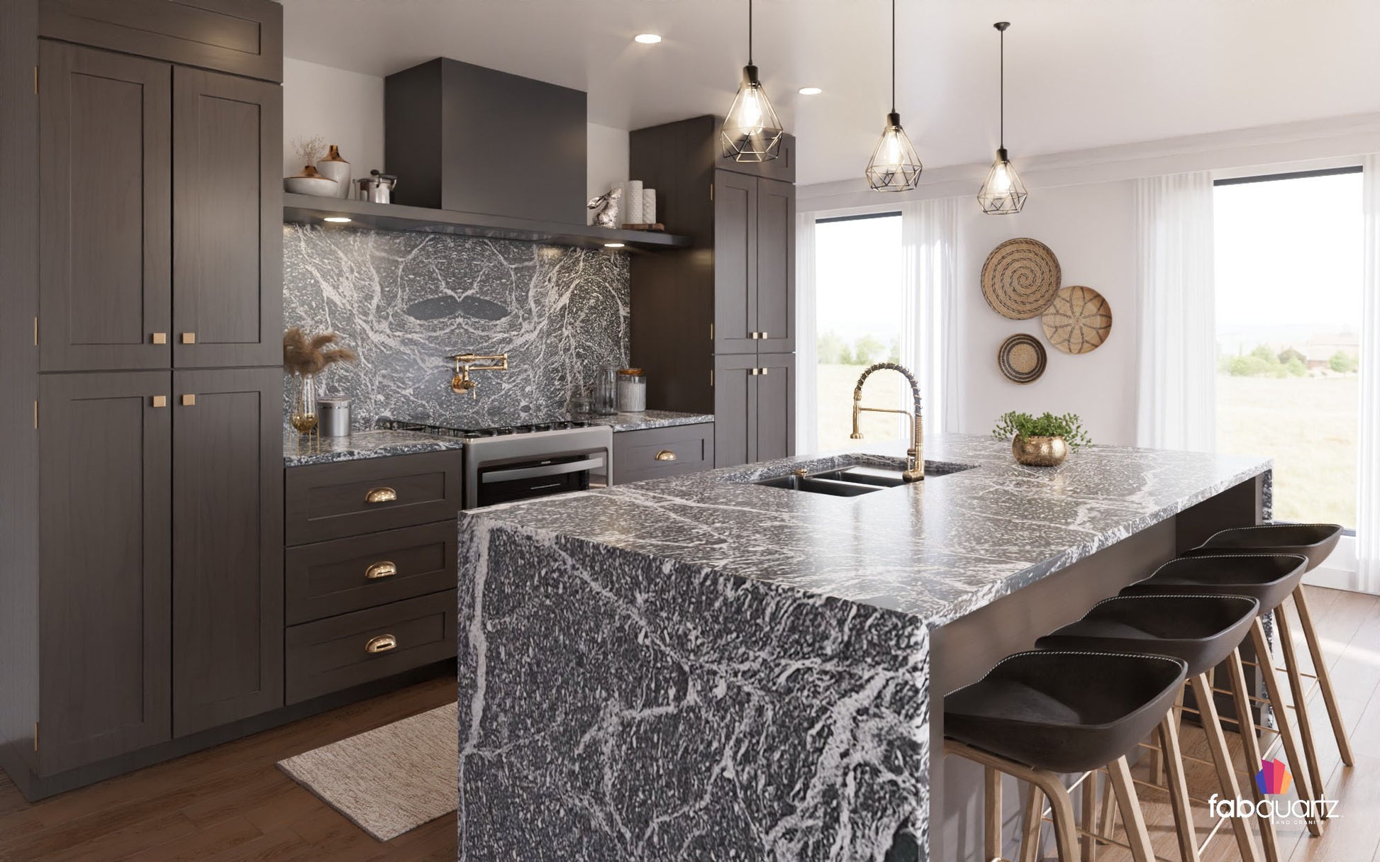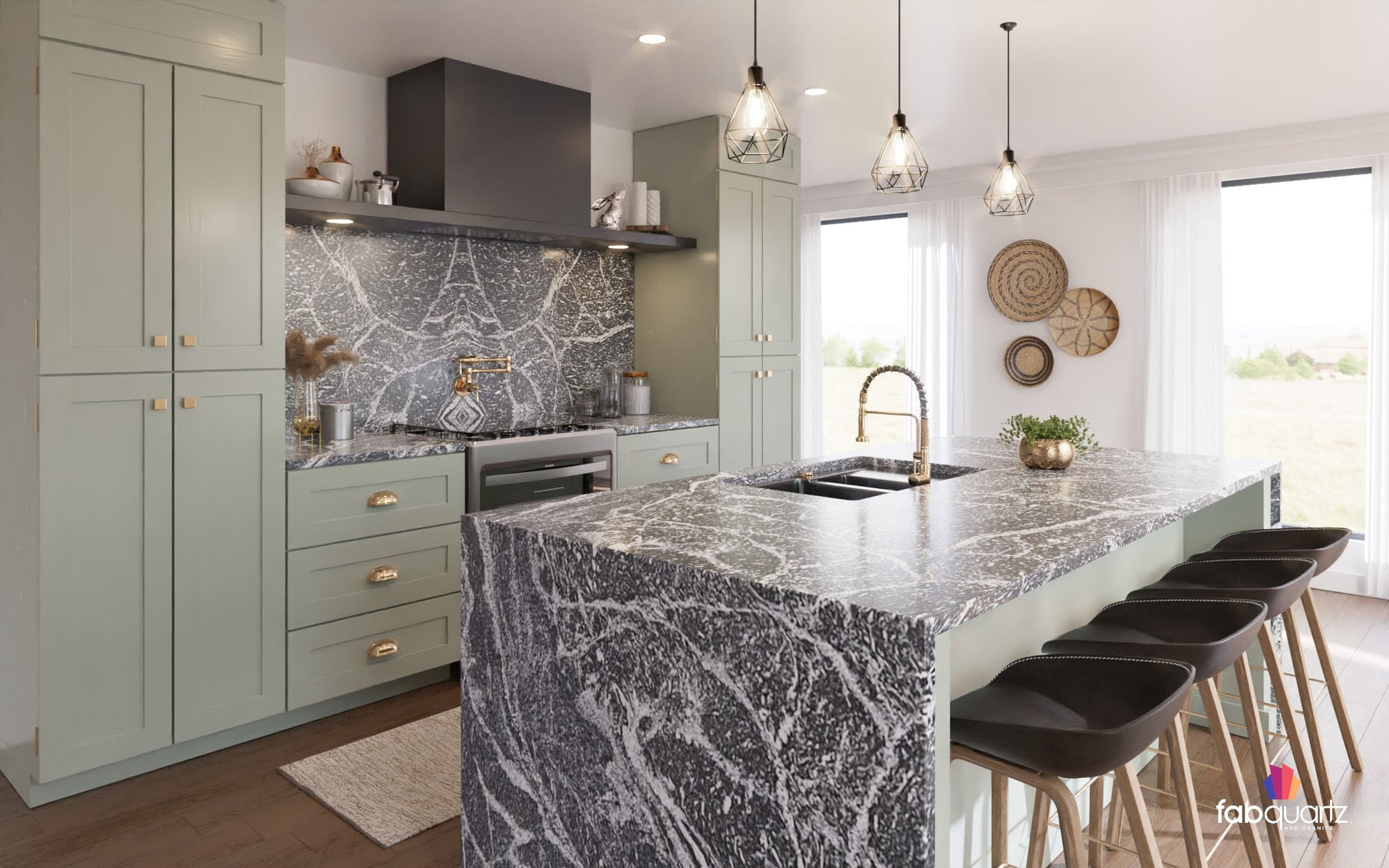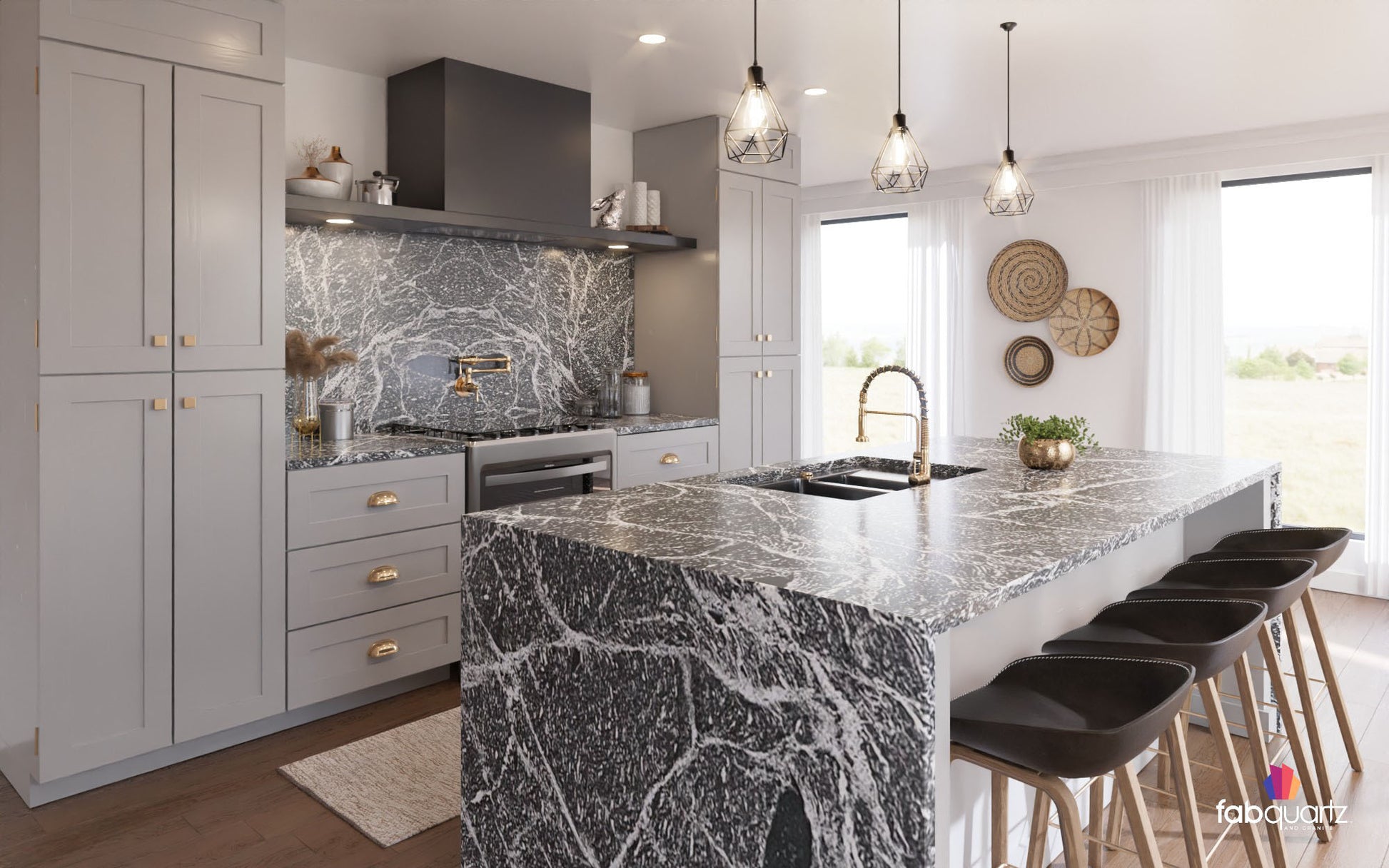 Silver Mist granite slabs feature frosty white veins and black pockets in a glistening charcoal field. Elevate your living spaces with custom granite countertops, backsplashes, floors and fireplace surrounds by FabQuartz. Call today to kick off your kitchen or bath remodel with one of our natural stone design experts.