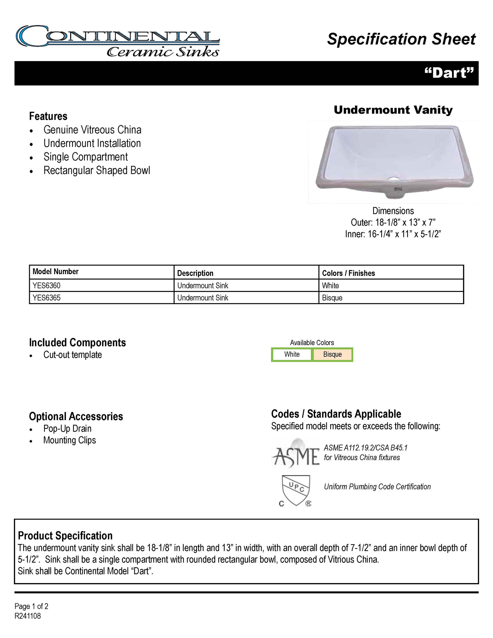 Continental Ceramic Rectangular Undermount Sink (Dart) Specifications